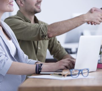 New team member. Two cheerful colleagues shaking hands and smiling while having a meeting in the